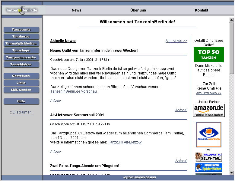 Nun, wie kommt man auf die Idee, eine solche Seite zu erstellen? Es fing praktisch sehr klein an - ich sollte damals für den Turnierkurs der TU Berlin eine kleine Seite erstellen, die den Kurs vorstellt und die zum Informieren der neusten Tanz- und Turniertermine dienen sollte.